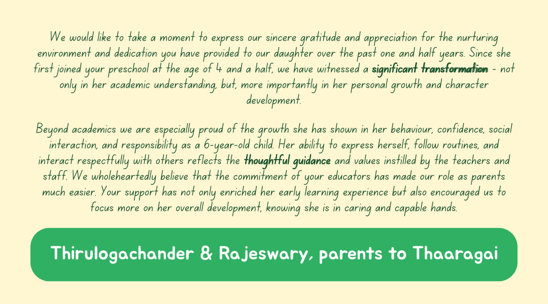 Central to this commitment is our belief in meaningful Parent–Teacher collaboration. By working closely with families, we cultivate a supportive ecosystem that empowers each child to learn and grow at their own unique pace. We recognise and celebrate individual differences, tailoring our approach to unlock every child’s fullest potential. Beyond academic readiness, we place strong emphasis on character development — nurturing resilience, empathy, confidence, and a sense of responsibility — shaping not only capable learners, but well-rounded individuals prepared to contribute positively to society.