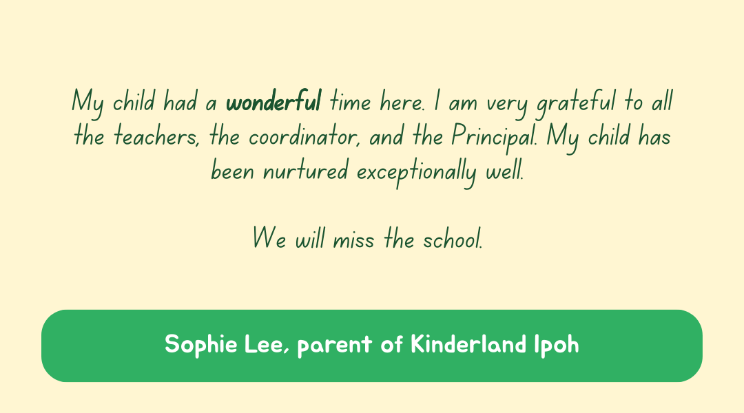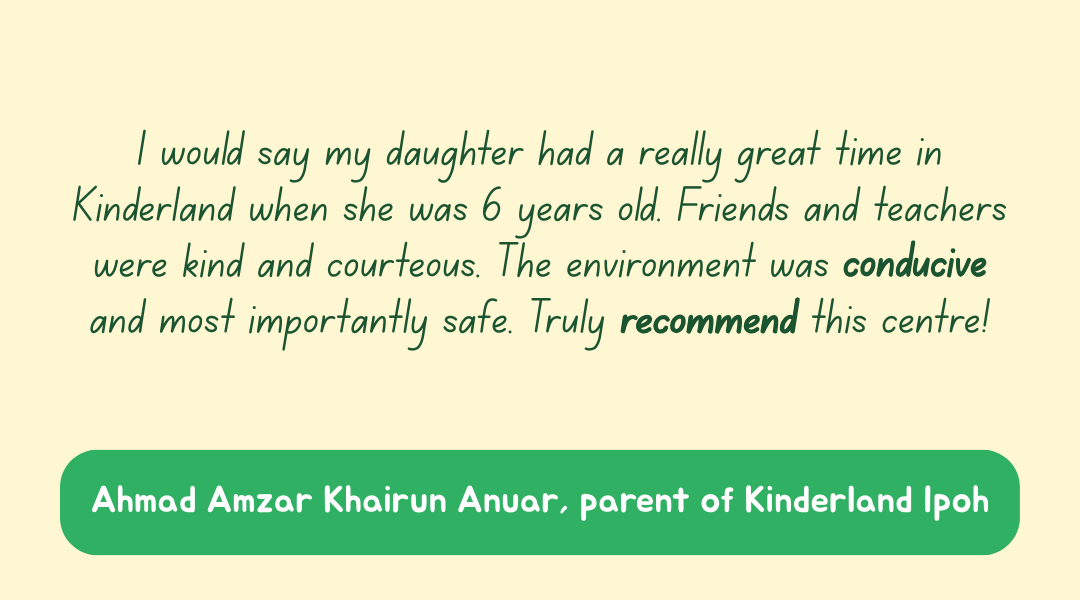 Kinderland Ipoh offers programmes from 18 months old – 6 years old.