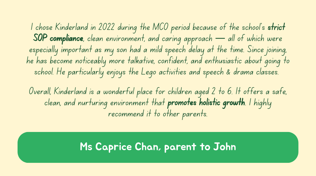 Choosing Kinderland means selecting one of the leading preschools with a unique music-infused curriculum in Malaysia, ensuring your child receives top-notch education and care. Our preschool programme is designed to nurture and develop your child’s potential through a balanced and engaging curriculum.