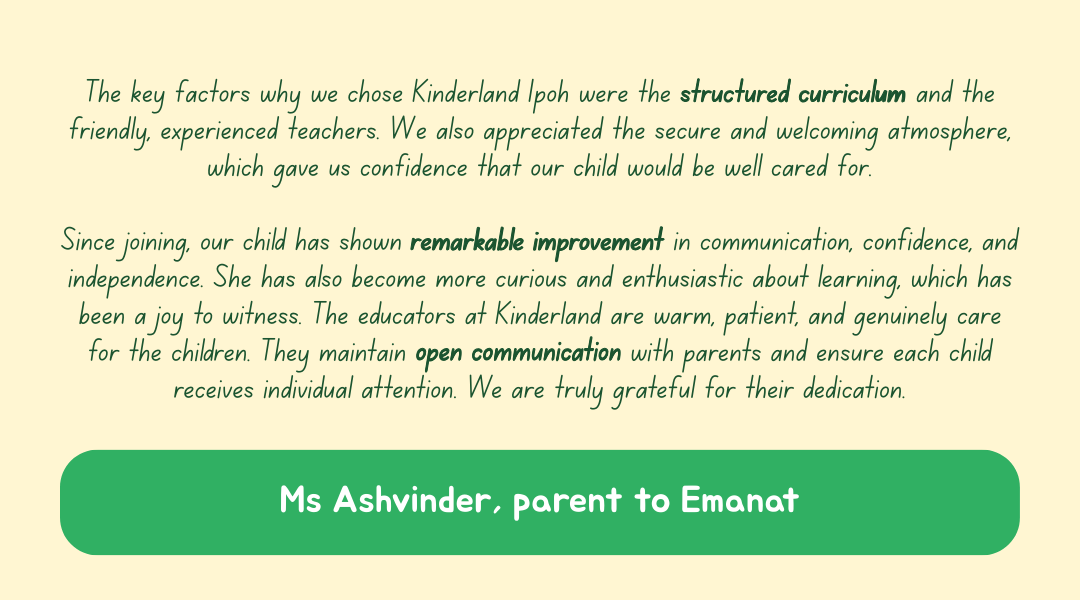 Located in the serene surroundings of Ipoh, Kinderland Ipoh is a trusted preschool in Ipoh offering a premium early childhood education experience within a spacious green environment. Our calm, nature-inspired setting creates the ideal foundation for focused learning, emotional well-being, and joyful exploration — allowing children to grow with confidence and curiosity from their earliest years.