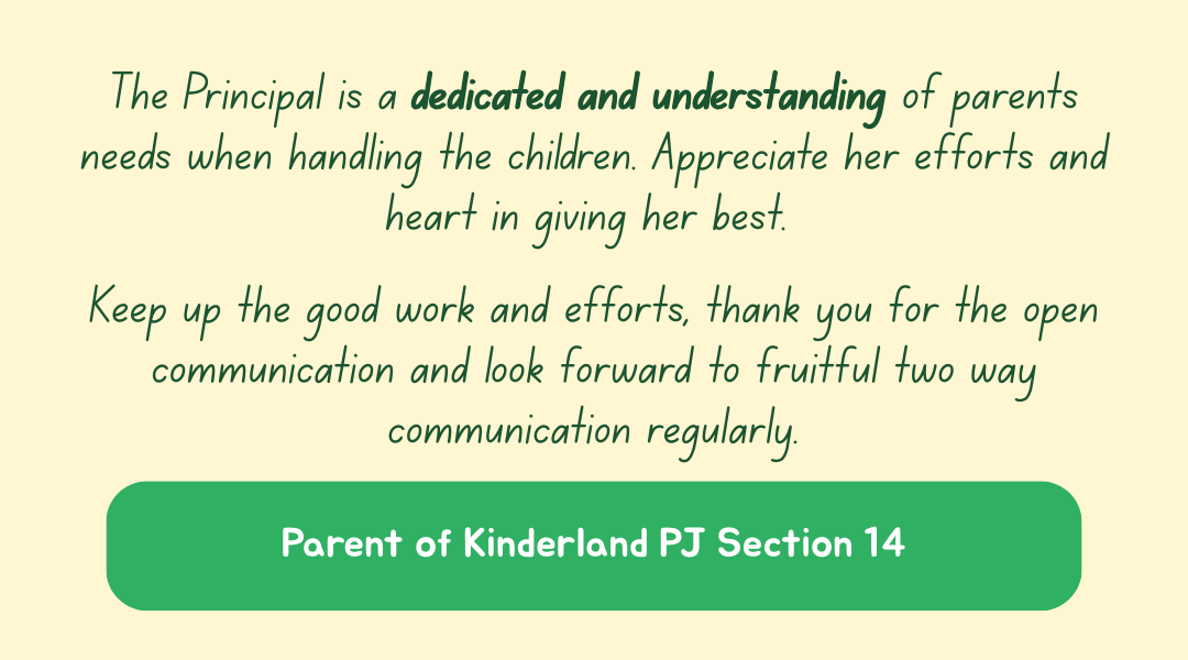 Kinderland Playhouse PJ Section 14 boasts a spacious outdoor facilities where children are encouraged to do what they do best – learn as they play. With an eloborate play area, children’s garden, and iBotanic, Kinderland Playhouse children are free to explore and build a positive and caring relationship with nature. Our indoor space, including classrooms, music area and reading area, is also purposefully set up to give children a conducive space for learning and growing.