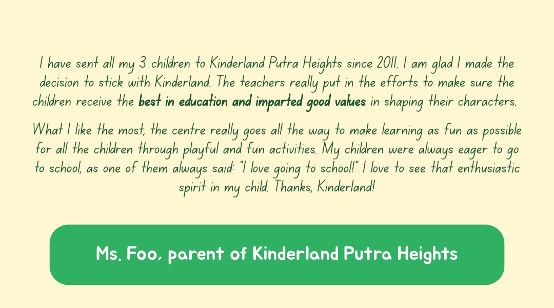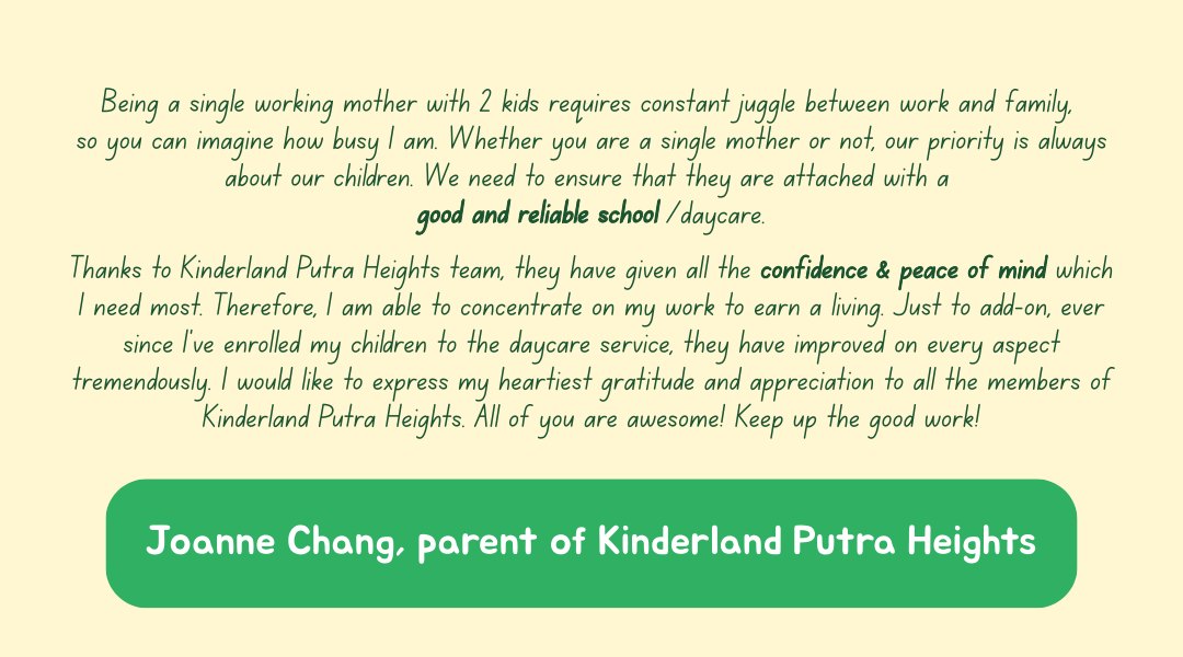 Kinderland Putra Heights offers a complete preschool journey from infant care to Primary 1 readiness. With spacious classrooms and a nurturing environment, we focus on strong parental partnership and holistic growth. Working parents can feel assured knowing their children are loved, well-cared for, and developing confidently every step of the way.